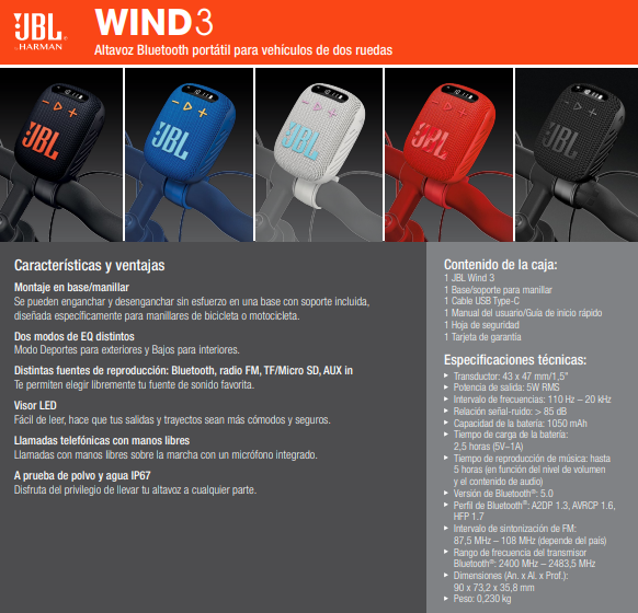 Ya sea en la bici, moto, en la playa o en una caminata, el JBL Wind 3 te acompaña con un sonido potente y claro. Su resistencia al agua, múltiples modos de conexión y diseño portátil lo hacen el mejor compañero para cualquier aventura.