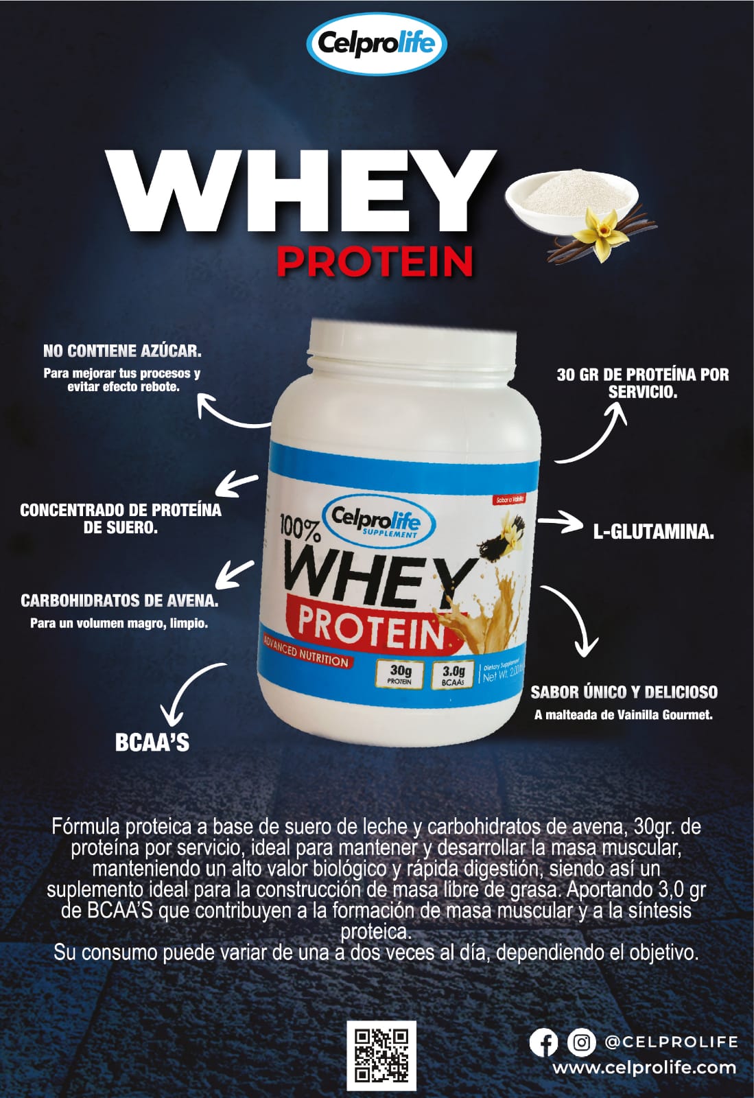 🏋️♂️ Celprolife Whey Protein te da 30g de proteína de alta calidad por servicio, ideal para aumentar y mantener masa muscular libre de grasa.